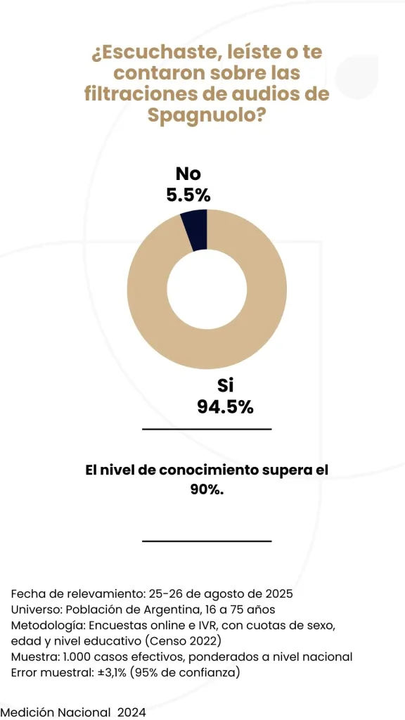 La mayoría de los bonaerenses sigue de cerca el Caso Spagnuolo: el 94,5% afirma conocerlo y un 73,2% lo considera grave y exige explicaciones por presuntas coimas , según un relevamiento reciente de Managment & Fit. La encuesta refleja además que la ciudadanía exige respuestas públicas y claridad sobre la implicancia de Karina Milei y otros funcionarios.