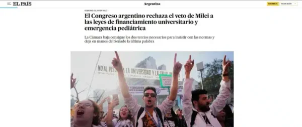El diario español El País tituló: “El Congreso argentino rechaza el veto de Javier Milei a las leyes de financiamiento universitario y emergencia pediátrica”. Destacó que la Cámara baja logró los dos tercios necesarios para insistir en las normas y dejó la decisión final al Senado.