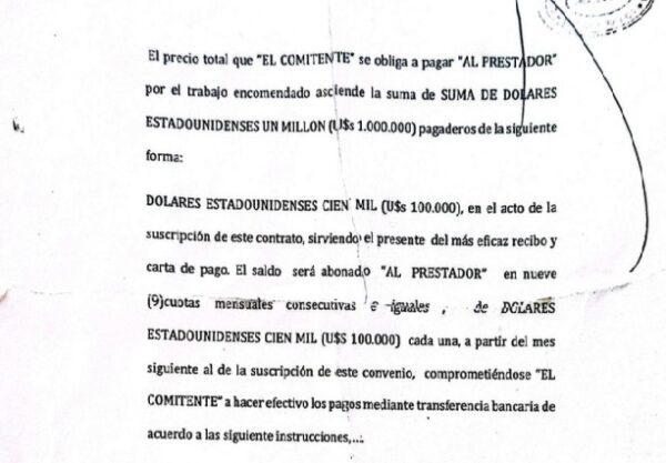El contrato, firmado apenas dos semanas antes de que Espert lanzara formalmente su candidatura presidencial, estipulaba que 100.000 dólares debían abonarse “en el acto de la suscripción” y el resto en nueve cuotas mensuales consecutivas e iguales de 100.000 dólares mediante transferencia bancaria. Según los registros, entre junio de 2019 y marzo de 2020, es posible que Espert haya cobrado la totalidad del monto, generando sospechas tanto por el elevado valor como por la falta de evidencia de que se hubiera realizado el trabajo acordado.