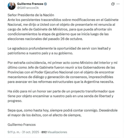 En su carta, Francos explicó que su salida busca que Milei pueda «afrontar sin condicionamientos la etapa de gobierno que se inicia» tras los comicios.