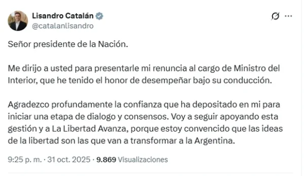 «Señor presidente de la Nación. Me dirijo a usted para presentarle mi renuncia al cargo de Ministro del Interior, que he tenido el honor de desempeñar bajo su conducción», comunicó Catalán a través de un posteo en su cuenta de la red social X.