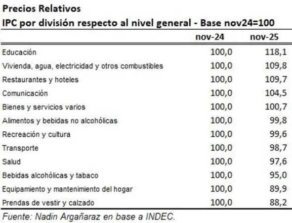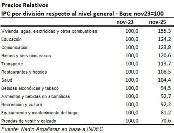 El informe que recibió Agencia Noticias Argentinas indicó que “entre noviembre de 2023 y noviembre de 2025 siete componentes aumentaron su precio relativo y cinco lo bajaron”.