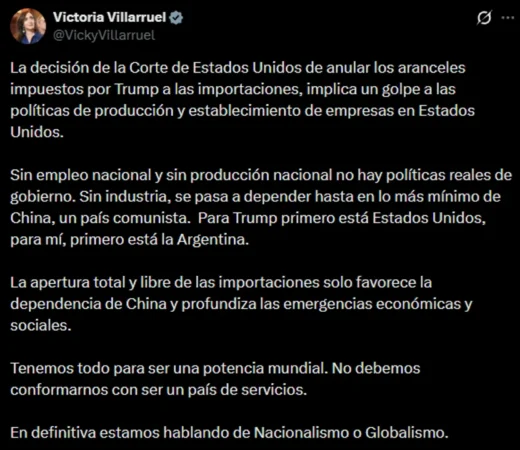 Por Jorge Victorero. La reciente declaración de la vicepresidenta Victoria Villarruel —“Sin producción nacional no hay políticas reales de gobierno”— no fue un simple posteo en redes; fue un manifiesto de ruptura ideológica. Al defender los aranceles de Donald Trump (anulados recientemente por la Corte de EE.UU.) y vincularlos con la crisis industrial argentina —personificada en el cierre de la planta de FATE—, Villarruel ha trazado una línea en la arena.